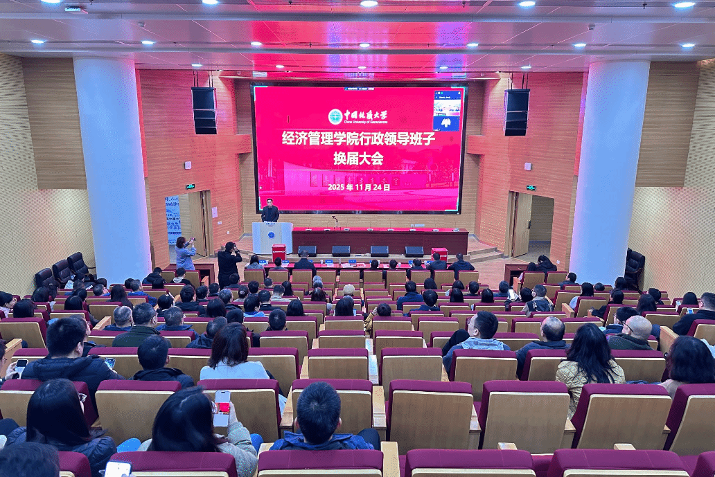 2025年11月24日下午,经济管理学院在经管大楼二楼报告厅召开行政领导班子换届大会。校党委常委、副校长夏帆,党委组织部副部长王珩到会指导,学院全体教职工参加会议。会议由学院党委书记薛保山主持。